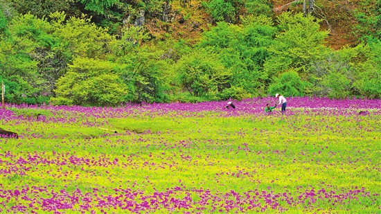 端午节前,被称为泸沽湖后花园的木底箐牧场报春花盛放。连片的玫红色小花迎风摇曳,与牛羊、村庄、河流共同绘就了一幅田园风景画。在海拔2900多米的木底箐高山植被区,报春花在端午节前后盛开,当地的普米族群众称为“端午花”。目前,报春花已成为泸沽湖区域高山花卉的独特代表。据初步统计,木底箐牧场现有30余种报春花。