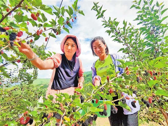 近年来,大理白族自治州巍山彝族回族自治县发挥自然资源优势,以“党支部+公司+合作社+农户”的模式,扶持引导农民发展樱桃、桑葚、车厘子、蓝莓等高原特色水果种植,推动观光农业与乡村旅游融合发展,助力脱贫攻坚,振兴乡村经济。图为游客在巍山县南诏镇二台新村果园采摘桑葚。本报通讯员 陆向荣 摄