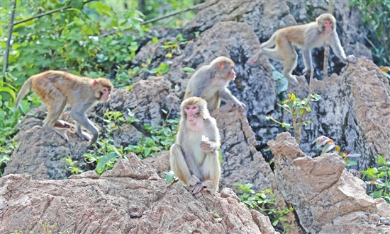 6月下旬,在曲靖市罗平县旧屋基彝族乡小寨村万猴山野生猕猴保护基地,随着护林员王海四的呼唤,群猴从茂密的山林中接连跑出来,聚集到定点投食点“进餐”。 “现在村里的猴群数量有300多只,我每天都要分两次定时投喂并查看猴群情况,每年猴群数量都在增长。”王海四是土生土长的彝家汉子,从小就听老人讲山中猴子的故事。过去,由于保护力度不够,加之石漠化严重导致的生态破坏,当地已很难见到野生猕猴的身影。自从建立了罗平县万峰山自然保护区,加强生态保护、环境整治之后,当地野生猕猴的种群才重现身影,现在已达到了2000多只。2016年,王海四被聘为生态护林员,在管护哨所专职管护村里的猴群。“猴群多了,也出现猴群损毁农作物、侵扰村寨等问题,建立保护基地进行定点定时投喂,就是为了保护好猕猴,还能解决好因猴群增长带来的生态冲突问题。”王海四说。 近年来,旧屋基彝族乡小寨村围绕美丽乡村建设大力开展农村人居环境整治,通过争取省级“民族特色示范村”项目资金100万元,实施村庄道路和庭院硬化、改厕改圈、绿化亮化等工程项目,并通过群众集资和政府补助相结合的方式开展配套设施建设,村容村貌和人居环境得到了全面提升,实现环境美、风尚美和秩序美的新风貌,同时以人居环境整治为契机,通过生态家园建设突显美丽乡村的和谐美。 本报记者 杨峥 茶志福 文/图