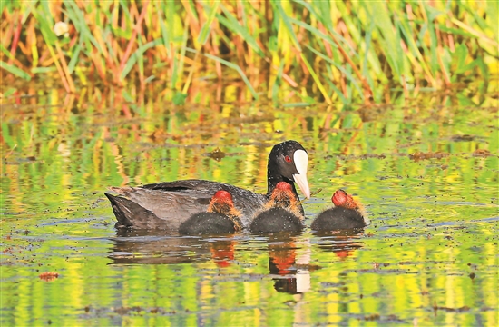 本报讯(记者 杨艳鹏 李建国 通讯员 段红莲) 近日,保山青华海国家湿地公园管理中心的工作人员首次监测到2只成年骨顶鸡和5只幼鸟,它们在莕菜群落间觅食嬉戏。这是继绿头鸭之后第二种在青华海繁殖的冬候鸟。 监测中发现,骨顶鸡幼鸟红色的小脑袋长出几根稀疏的毛发,黑黝黝的小眼珠,身上的羽毛乱蓬蓬的,像个小毛球。 骨顶鸡是鹤形目秧鸡科的体型较大的黑色水鸟,具有显眼的白色锥形嘴及额甲,所以也叫白骨顶,全身体羽呈深黑灰色。骨顶鸡的分布较广泛,遍布我国境内大部分地区。主要在非洲、东南亚及菲律宾等地越冬,夏天常在中国北方湖泊及溪流繁殖,在云南部分地区也有繁殖记录。
