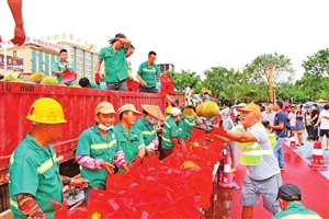 7月19日,芒市第三届文明果实分享活动在芒市广场举行。市民游客领取一袋袋果香馥郁的波罗蜜和芒果,共同分享属于这个城市的丰收与喜悦。芒市文明果实分享活动已举办三届,每年七八月,芒市有关部门都会将道路边成熟的水果采摘分发给市民,并送往社区、敬老院、福利院,为低保人群、孤寡老人、困难群众送去关爱。
