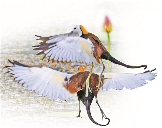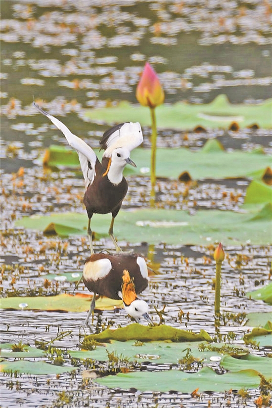 水雉的到来给异龙湖国家湿地公园增添了一抹亮色,也吸引了很多摄影爱好者和爱鸟人士慕名而来。广袤的异龙湖国家湿地公园和姿态翩翩的“凌波仙子”,呈现出了一幅人与自然和谐相处的美丽画卷。