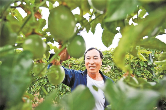 施甸县摆榔乡尖山村的杨子周去年带着3户农户种植10亩百香果,户均增收2万余元。今年,他又帮助16户农户发展种植200多亩百香果,让20余户建档立卡贫困户实现家门口就业。进入7月,果园内一串串百香果缀满枝头,个个浑圆饱满。图为杨子周在自家果园里采收百香果。本报记者 陈飞 摄