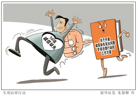 近日,中央精神文明建设指导委员会印发《关于开展诚信缺失突出问题专项治理行动的工作方案》,针对当前经济社会中的诚信热点问题和群众反映强烈的失信突出问题,组织中央文明委有关成员单位,集中开展10项诚信缺失突出问题专项治理行动。 新华社发 朱慧卿 作