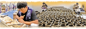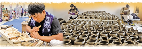 本报记者 黄兴能 文/图 近年来,中央美术学院对口倾情帮扶剑川县,在“扶智”“扶技”“扶艺”上下功夫,以文化的力量和艺术的创意,促进剑川传统文化和传统工艺“活”起来,助力剑川脱贫摘帽奔小康。在中央美术学院对口倾情帮扶下,剑川传统工艺发展迅速,活力满满,呈现新气象。 传统工艺融入现代生活 在剑川名匠董志明的工作室里,记者看到展示厅里,茶具、甲马、大大小小的陶罐等工艺品琳琅满目,造型优美。董志明告诉我们,剑川县甸南镇天马村善作陶器,但过去的产品比较单一,主要是花盆和土锅,现在的“华丽蜕变”皆因有了中央美术学院的帮助。 2013年4月以来,中央美术学院对口帮扶剑川县,以提升剑川木雕、石雕、土陶、布扎、刺绣等工艺品的文化附加值为切入点,启动了“解读与创意剑川”设计系列综合课题调查研究活动,助力全域旅游发展和脱贫攻坚。董志明便是帮扶项目众多受益者之一。 “以前瓦猫只有六七个品种,中央美院师生帮助我设计研发后,现在已增加到100多个品种。”董志明说,虽然家里一直做陶艺,但所做的陶器仅限于一些生活用具。“中央美术学院的师生们思维活跃,工艺精湛,他们帮我设计包装盒,研发新品,普通的生活用品经他们重新设计包装后,价值提升,变成了艺术品,市场供不应求。” 中央美术学院驻剑川传统工艺工作站设在剑川古城里的一个白族小院,于2017年11月11日挂牌成立。白墙上的两行黑色大字格外醒目:“传统工艺走进现代生活,现代设计走进传统工艺。” 中央美术学院教师强勇于2016年4月到剑川县挂职任副县长。他两次延长挂职时间,倾尽全力开展文化帮扶。如今已卸任剑川县挂职副县长职务的他仍担任着工作站站长。他认为,通过剑川延续至今的文化底蕴结合中央美术学院的设计资源,将“现代剑川”连接到“未来剑川”才能使帮扶工作实现共赢。要完成这一目标,需要把剑川白族文化和中央美院所担负的美育普及嫁接起来,通过美育普及实现增收,促使经济发展,继而推进乡村振兴,从而绽放“帮扶之花、合作之花、美育之花、振兴之花、幸福之花”。 “2016年9月9日,剑川土陶协会挂牌,我们负责帮助剑川研发土陶新产品。”在调研中,强勇觉得,剑川土陶不光要注重实用性,还要根据市场需要做设计上的提升和改造。他带着学生,新研制出了土陶烧烤盘以及土陶版的“甲马”,提升了剑川传统工艺创意设计水平和旅游商品档次。它们不仅兼顾实用功能,同时也是精美的工艺品,一经推出,受到市场欢迎。 提升传统技艺水平 俗话说“朽木不可雕”。可是在剑川木雕传习馆馆长施顺华眼里,朽木不“朽”,经他的巧手,一块块被人当做烧柴的朽木,成为一件件巧夺天工的艺术品。2014年到中央美院进修后,施顺华感觉思路一下子开阔了,“保留传统,并不能单纯复制过去,更应该创新和突破。” “我们每年遴选出5名优秀的传统工艺从业者到中央美术学院去随堂上课、跟班学习。”强勇介绍,学院尽可能提供方便和解决食宿,学员选择符合自己的课程跟班学习。如今,已有9批次近100名剑川学员前往中央美院“充电”。 张绍华是剑川青年画家,他曾到中央美术学院进行为期3个月的学习。他说:“通过学习,我夯实了理论功底、拓宽了眼界,了解了行业的发展,对我的创作方向和创作理念产生了根本影响。”中央美术学院为像张绍华一样的文化人才和手工匠人开通了到高校学习、向专家学者学习的绿色通道,形成了比学习、比技艺、比研究的良好氛围,有效提升了行业水平。 “中央美术学院与剑川职业中学共同合办的美术教育实验班已开始招生,目的就是要在下一代心中埋下文化的种子。”来自中央美术学院的剑川县挂职副县长韩文超说,今年到剑川支教的美院学子从3名增加到4名,还邀请中央美术学院对外美术教育交流中心师生到剑川,现场指导美术教育。 目前,剑川已建成7个非物质文化遗产传承和实训基地,每年培训非遗传承学员不少于1000人次。通过“建立一项机制、培养一批人才、引领一个产业、带富一方百姓”,在全县实施“剑川名匠”选育工程,积极探索乡土技能人才培养新模式。 一大批能工巧匠通过培训学习后,建立工作室,发挥能人带动作用,把课堂设在生产车间、田间地头、户内户外,提升了剑川传统手艺的技艺水平。 搭起走出去舞台 “剑川文化丰富多彩,是白族文化的聚宝盆。为了帮助传统艺人们搞清剑川的文化根源,有必要从人文角度梳理出剑川文化和工艺传统,让他们知道为什么要这么做?该怎么做?”强勇介绍,培养专业人才就是为了研发更好的产品,研发产品的前提就是培养专业人才,这好比左右轮的一辆车,上面载着的就是中央美术学院工艺大讲坛。 “通过学习,让我重新认识民族工艺,对我们木雕的未来充满信心。”木雕省级非遗传承人杨焕培信心满满。 “剑川的传统技艺缺乏的就是行业自信,中央美院不遗余力地举办各种学术论坛、研讨会,举办工艺大讲坛和展览活动,给了剑川传统工匠一双看世界和看未来的眼睛,让大家不断增强文化自信,自觉参与到传统技艺的传承保护和发展壮大中。这种潜移默化的影响,正在悄悄地改变着剑川传统工艺。”国家级工艺美术大师段国梁说。 围绕剑川传统工艺的文化价值提升、学术界的认同和影响力的提高等,中央美术学院广泛开展各种研