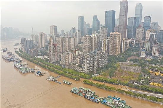 据新华社重庆8月19日电(记者周凯 周闻韬) 受长江上游强降雨影响,长江、嘉陵江洪峰19日抵达重庆市主城区,重庆市正迎来今年入汛后最大洪水。 长江上游干流以及多条支流洪峰叠加来袭,导致长江、嘉陵江重庆段水位大幅超保证水位,重庆将面临1981年以来最高位长江洪水。据长江上游水文局监测,19日8时重庆市主城区长江寸滩站水位为188.94米,超过保证水位5.44米;长江菜园坝站水位为190.77米,超过保证水位5.77米。嘉陵江磁器口站水位192.59米,超过保证水位6.95米。 19日上午,不断上涨的洪水将重庆市南滨路、嘉滨路淹没,重庆主城区多条道路已实施交通管制。记者在临江的重庆轨道交通2号线黄花园站看到,上涨的洪水已淹没行车轨道桥墩,列车仍在正常运营。在长江、嘉陵江两江交汇处的长嘉汇景区,水流十分湍急,停泊在江上的趸船几乎与路面齐平。此外,重庆洪崖洞、朝天门、磁器口等多处知名景点部分区域也被淹没。