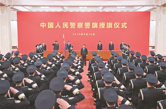 新华社北京8月26日电 中国人民警察警旗授旗仪式26日在人民大会堂举行。中共中央总书记、国家主席、中央军委主席习近平向中国人民警察队伍授旗并致训词,代表党中央向全体人民警察致以热烈的祝贺。他强调,我国人民警察是国家重要的治安行政和刑事司法力量,主要任务是维护国家安全,维护社会治安秩序,保护公民人身安全、人身自由、合法财产,保护公共财产,预防、制止、惩治违法犯罪。新的历史条件下,我国人民警察要对党忠诚、服务人民、执法公正、纪律严明,全心全意为增强人民群众获得感、幸福感、安全感而努力工作,坚决完成党和人民赋予的使命任务。