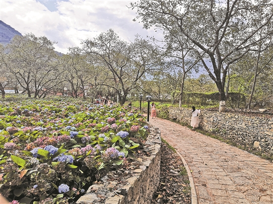 云上村庄深藏于漾濞县苍山西镇光明村鸡茨坪。近两年来,漾濞苍山石门关旅游开发有限责任公司与村民联合开发旅游业,投资1.2亿元改善基础设施,在核桃林下分别打造了春园、夏园、秋园、冬园和云上之恋主题公园,种植樱花、绣球花、海棠花、杜鹃花等花木,一年四季有“花海”,“村在林中、房在树中、人在景中”的美景吸引省内外游客纷至沓来。