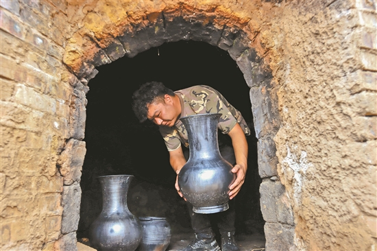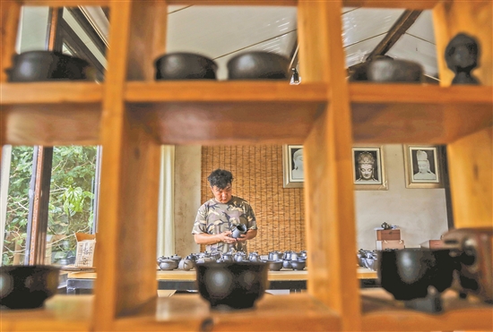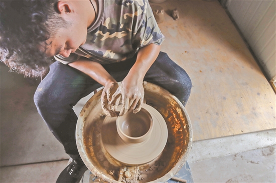 剑川木雕,闻名全国,但土陶制造在这里也有着自己独特地位。在剑川海口门遗址中就曾发现大量土陶器,土陶因其在窑内素烧时熏制呈黑色,也被称为“黑陶”。 田超是地道的剑川人,他幼时就爱“玩泥巴”。18岁从剑川职业中学毕业后,田超师从当时的民间传统艺人蔡焕章学习白族土陶制作,如今开了一家名为“尚轩”的土陶工作坊。 “土陶的泥是经过专门挑选的。”田超边介绍边为我们演示了土陶的制作过程。他取来一块泥团,一番揉捏后,将泥块放在了拉坯机上,他脚踩机器转动转盘,用手不断塑形,泥块变成了一个罐子的形状。“等阴干就可装窑烧制,练泥、拉坯、修坯、刻花、打磨、晾干,最后烧制便完工了。” 作为年轻一代的土陶艺人,他还是剑川县非物质文化遗产传承人。田超潜心研究土陶制作,在传统陶器的基础上结合当代文化元素和剑川白族文化特点,进行土陶的创新研发和拓展,从传统实用性陶器到手抓壶、茶宠、香插等,生产出更适合现在年轻一代喜欢的文旅产品。 本报记者 黄兴能 摄影报道