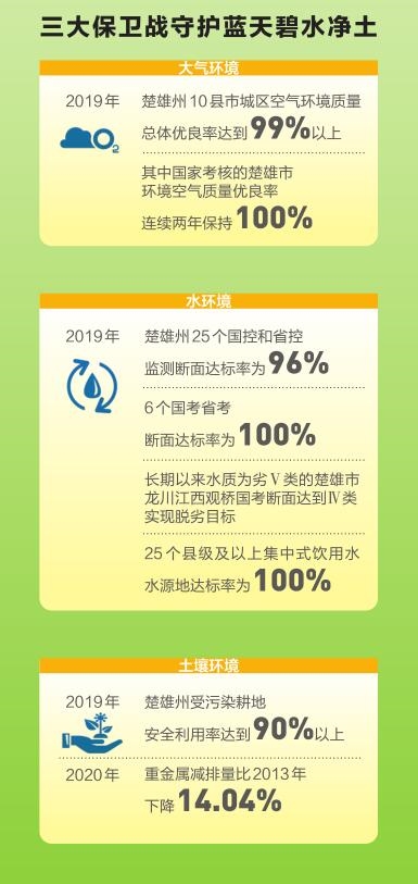 本报记者 吕瑾 秦明豫 11月30日,国家生态文明建设示范市县、“绿水青山就是金山银山”实践创新基地表彰授牌活动在北京举行。生态环境部对87个第四批国家生态文明建设示范市县、35个“绿水青山就是金山银山”实践创新基地和10个“2018—2019绿色中国年度人物”获奖集体和个人进行表彰授牌。楚雄彝族自治州获“第四批国家生态文明建设示范州”称号,楚雄州大姚县被命名为“绿水青山就是金山银山”实践创新基地。 近年来,楚雄州以习近平生态文明思想为指引,牢固树立“绿水青山就是金山银山”和“共抓大保护、不搞大开发”的发展理念,以建设最美中国彝乡、打造“滇中翡翠”和全省生态文明建设先行示范区为目标,深入实施国家生态文明建设示范州规划和楚雄州“1133”发展战略,坚决打赢蓝天、碧水、净土三大保卫战和饮用水源地保护等七个标志性战役,全州生态环境质量和生态文明建设水平不断提升。 今年,随着创建“国家生态文明建设示范州”各项指标全面达标,楚雄州生态环境质量不断改善,生态文明理念深入人心,在“生态立州 绿色发展”战略的指引下,“滇中翡翠”的成色被越擦越亮。 高位推动创新机制 开创生态文明建设工作新局面 每一份荣誉的背后,都有着坚持不懈的投入与付出。 2018年1月11日,楚雄州委九届三次全会提出了“1133”发展战略,将打造全省生态文明建设先行示范区列入其中,切实把生态文明建设作为一项重大政治任务、重大民生工程和重大发展问题来抓,要求全州上下在今后一段时期内,在打造全省生态文明建设先行示范区上取得实质性突破。2018年9月,在楚雄州生态环境保护大会上,明确提出楚雄州要着力打造“滇中翡翠”,努力把楚雄建设成为全省生态文明建设先行示范区和全省最美丽州市之一。 在推进生态文明示范区建设的征程中,楚雄州始终高起点谋划、高标准要求、高质量推进,成立了由州委书记、州长任双组长,州委常委、州人大常委会副主任、州政府副州长、州政协副主席等相关领导为副组长,全州各有关部门相关负责人为成员的生态文明州创建工作领导小组,构建“党政统一领导、部门分工协作、社会共同参与”的工作格局。该州先后出台了《关于努力成为生态文明建设排头兵的实施意见》《楚雄州党政领导干部生态环境损害责任追究实施办法(试行)》《楚雄州打造全省生态文明建设先行示范区行动计划》等系列政策文件,印发实施《楚雄州省级生态文明州建设规划(2017-2020年)》《楚雄州“十三五”生态文明建设排头兵规划》《楚雄州生态文明先行示范区建设实施方案》等,为全州生态文明建设奠定坚实基础、厚植发展后劲。 特别是近年来,楚雄州先后制定生态文明建设目标评价考核办法、指标体系、目标体系,将生态环境保护和生态文明建设工作纳入党政综合绩效考核,生态文明建设工作在党政综合绩效考核的权重达到23%,充分调动了领导干部抓好抓实生态文明建设的主动性。 2019年,楚雄州通过开展“干在实处,走在前列”大比拼,全州生态文明创建活力不断迸发,在生态文明示范创建方面实现创优争先,全州9个县市创建省级生态文明县市通过考核验收公示,103个省级生态文明乡镇创建全覆盖;楚雄市获“全国绿化模范单位”称号,双柏县成功创建2019年“全国森林康养基地建设试点县”“第七批全国民族团结进步示范县”“中国天然氧吧”,2020年大姚县被命名为“云南省美丽县城”。此外,楚雄州全面推行河(湖)长制工作在全省16个州市中被考核为第一名。 生态改善、环境宜居赢得了诸多殊荣,更赢得了老百姓的称赞。截至2019年,楚雄州林地面积达3341.2万亩、森林面积2906.1万亩,均居全省第二位;森林覆盖率从2015年的63.5%上升到2019年的68.01%;10县市空气优良率达99.7%,州府所在地楚雄市空气质量优良率连续两年保持100%,城乡生态环境质量持续改善,人民群众获得感、幸福感进一步增强。 改善生态环境质量 引领绿色经济社会全面发展 围绕坚决打赢蓝天、碧水、净土三大保卫战和污染防治保护等7大标志性战役,近年来,楚雄州聚焦突出生态环境问题,全面彻底如期抓好各类环保督察反馈问题整改,持续推进城镇和农村人居环境整治,大力改善城乡生态环境质量,建设美丽楚雄。面对国家生态文明建设示范州创建的9项申报条件、34项建设指标,楚雄州已全面达标。 在中央生态环保督察和中央生态环保督察“回头看”中,楚雄州涉及38个问题,目前已全部完成整改。全州林草覆盖率高达79.88%,“两屏两带多点”生态安全屏障进一步筑牢,截至2019年底,全州二氧化硫、氮氧化物、化学需氧量和氨氮4项主要污染物约束性指标排放量全部完成云南省下达的目标任务,重金属排放量削减提前1年超额完成省下达的目标任务,主要约束性指标全面完成。 2019年,国家和省级控制断面水体优于Ⅲ类比例达84%,25个县级及以上饮用水水源地水质达标率100%;全州10县市城区空气环境质量总体优良率达到99.7%,森林覆盖率达68.01%……天蓝、地绿、水清的优美环境已成为楚雄州最靓丽的名片。 与此同时,发挥生态环境保护的倒逼作用,推动经济结构转型升级、新旧动能接续转换,在高质量发展中实现高水平保护、在高水平保护中促进高质量发展,楚雄州产业生态化和生态产业化的生态经济体系初步形成,打造绿色能源、