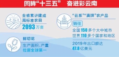 “十三五”期间,云南粮食和重要农产品生产能力全面提升。全省共划定粮食生产功能区和重要农产品生产保护区5239万亩,累计建成高标准农田2093万亩。粮食产量多年保持全国第14位,今年产粮1896万吨,产量、单产均创新高。2019年全省猪、牛、羊、禽肉总产量406万吨,全国排名由2015年底的第11位提升到第7位。鲜切花生产面积、产量位居全球第一,天然橡胶、咖啡、烤烟、核桃、中药材种植面积和产量连年保持全国第1位,甘蔗、茶叶面积和产量稳居全国第2位。第一产业增加值由2015年的2056亿元,提高到2019年的3038亿元,全国排名由第14位提升到第11位。菜篮子、果盘子产品品类丰富、供应充裕、价格平稳,有效满足了省内外供给。“云系”“滇牌”农产品销往全国150多个大中城市、110多个国家和地区,2019年出口额达47.8亿美元,居全省第一大出口商品地位,连续多年位居西部省区第1位、全国第6位。今年前三季度,全省农产品出口逆势增长9%。