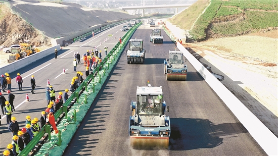 12月20日,昌宁至保山高速公路4标段路面上,一批无人驾驶设备有序进行摊压作业。这批智能施工设备包括2台摊铺机、3台双钢轮压路机、2台胶轮压路机共7台设备和一个技术控制室,实现全流程数字化协同施工,有利于提高施工质量、缩短工期。本报记者 赵丽槐 摄