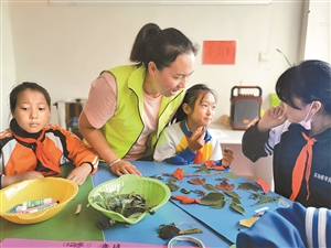 近年来,兰坪白族普米族自治县在易地扶贫搬迁安置点社区办起了趣味读书班、图书室等,给外出务工人员子女送教上门。图为兰坪县城安置点社区组织暖心团志愿者给孩子们上趣味课。