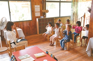 勐腊县勐伴镇河边村地处偏远地区,交通落后,为了孩子上学方便,28户村民搬迁到8公里外的公路边搭简易房居住。在社会各界的帮助下,河边村建起了“河边儿童活动中心”,一位当地的女大学生用假期当起了义务老师,带着村里10多个孩子学习游戏,寓教于乐。