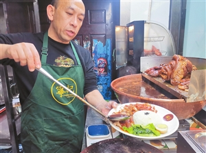 天还没亮,位于昆明鼎新街的泰国普吉岛宁记猪脚饭餐厅里,一锅秘制卤料正静静等候。老板杨俊忙着把刚送上门的新鲜猪脚清洗、沥干、油炸,冷却一小时后,猪脚投入卤料的“怀抱”。3个小时后“网红”猪脚成功“变身”,成为餐厅的招牌美食。 “我们家的猪脚饭之所以好吃,最关键的就是这锅卤料。”杨俊说,卤味店对卤水有很高的要求。“我们店2019年7月开始营业,这锅卤料从开店前一个月就开始熬制,到现在已经一年多了。”一锅原汁卤料,在猪脚的“配合”下,一日比一日醇香。“他家刚开业的时候我就来吃过,当时觉得味道不错,之后就经常来吃,味道越来越好,那个猪脚很入味。”前来用餐的顾客说。 宁记猪脚饭在昆明还属于“新鲜事物”,但在泰国普吉岛几乎无人不知,是深受当地人喜爱的美味。 杨俊介绍,宁记猪脚饭的创始人宁老师傅是一位泰国华侨,在普吉岛经营饭店已有24年。当年,为了制作出独特的猪脚饭,他品尝了泰国很多不同口味的猪脚饭,一遍一遍地配制卤料,最终找到了那个“对”的味道。 时间到了2014年,“老饕”杨俊到普吉岛旅行,偶然吃到了宁记猪脚饭,“实在是太好吃了。”为了这个难忘的味道,杨俊决定再去普吉岛拜师学艺,这一去就是4年。后来,杨俊不仅成功出师,还入股宁师傅,在普吉岛连续开了两家分店。 学到了新技能、开启了新事业,杨俊又有了新的主意。“我想把泰国美食带到中国,让更多的中国人品尝到地道的泰国味道。”于是,有了昆明街头这家小店。 开店一年多,宁记猪脚饭已经收获了一大批忠实食客:“这个猪脚饭,让我想起了当年在泰国留学的时光,跟朋友坐在街头小店,吃一碗猪脚饭。”“我们是第一次来,味道很好、很正宗,和在泰国街头吃到的味道一样。” 美食不止果腹,传承与交流同样存在于烹饪之中。杨俊说,浸润在美食中,纵使相隔千里,我们也能彼此沟通与了解。 本报记者 韩佳咪 胡丽仙 文/图