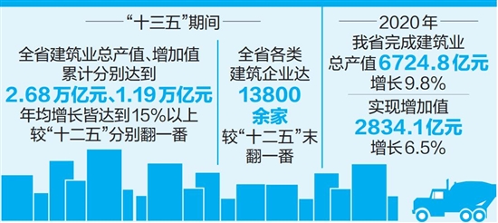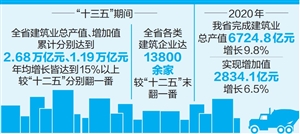 本报讯(记者 朱丹) 记者从近日召开的全省住房城乡建设工作会上了解到,“十三五”期间,全省建筑业总产值和增加值实现“双翻番”,有力助推全省经济发展。 “十三五”期间,我省建筑业发展量、质并举,取得显著成效。全省建筑业总产值、增加值累计分别达到2.68万亿元、1.19万亿元,年均增长皆达到15%以上,较“十二五”分别翻一番。税收累计1280亿元,占全省税收9%左右。建筑企业数量实现成倍增长,全省各类建筑企业达13800余家,较“十二五”末翻一番,其中,特级资质企业翻两番、一级资质企业翻一番。建筑业从业人数累计830万人,占全省就业人数的6%。 其中,2020年我省全年完成建筑业总产值6724.8亿元,增长9.8%,实现增加值2834.1亿元,增长6.5%,占全省GDP11.6%,进一步巩固了建筑业在全省经济社会发展中的支柱地位。建筑业提质增效实现。新增特级(综合)资质2项、一级资质8项,积极引进省外优秀企业,壮大建筑业产值规模。勘察设计行业发展突出,实现消防、人防等专项设计审查并入施工图审查,完成施工图审查5315项,总建筑面积1148万平方米。新增设计甲级资质8项,工程勘察设计企业营业收入迈上200亿元新台阶。通过持续推进安全工程和安全生产专项整治三年行动,全年房屋市政领域未发生较大及以上质量和生产安全事故;共获鲁班奖3项、国家优质工程奖9项、全国安全生产标准化交流学习工地13个。 值得注意的是,“十三五”期间,我省建筑业绿色发展理念逐步深化,绿色建筑推广起步良好。绿色建筑创建行动深入开展,全省累计推广绿色建筑超过2.6亿平方米,新开工装配式建筑超过1000万平方米。全省共有56家企业获得绿色建材标识,绿色预拌混凝土产量占比接近20%,现有国家装配式建筑产业基地7个,省级产业基地16个、示范城市1个。随着绿色发展理念进一步深化,2020年全省新建建筑全面执行绿色建筑标准,设计阶段绿色建筑占比达到82%,竣工阶段占比达到50%,新开工装配式建筑超过300万平方米。