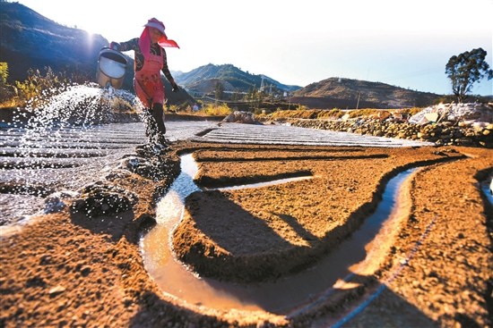 寒冬时节,巍山彝族回族自治县巍宝山乡建设村委会洗澡塘村30多户村民抓住晴好天气,纷纷下田整墒、洒水、取土、晒田,收获土碱碱花,抓紧制作土碱,每年户均增收达1万多元。