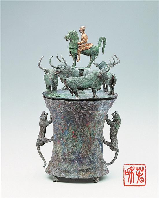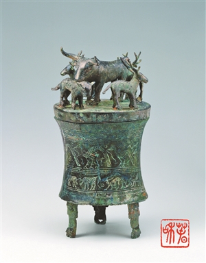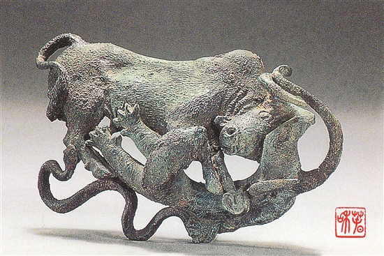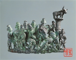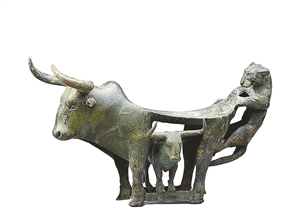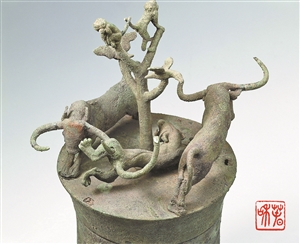 □ 樊海涛 缚牛崇牛习俗和“宴飨”典仪 江川李家山出土的一件“剽牛祭祀铜扣饰”表现了滇人缚牛、崇牛的习俗。扣饰最右侧的立柱上站立着一头公牛,它很可能是“神”的化身,是滇人崇拜的对象之一。石寨山还出土过一件精美的牛头铜扣饰,两牛耳上各饰一蛇,在《山海经》里,“珥蛇者”多为神的象征。柱侧11人正参与缚牛的活动。牛伫立不动,牛角根部系绳,穿在牛颈下结成活结。其他人有抱绳索者、抚牛背者、挽牛尾者,其中一人被牛角挑穿大腿,倒悬于牛角上,手仍抓牛绳不放,发髻披散,还有一人扑倒在立柱下。除了倒悬于牛角上的人外,其他人物多面带微笑,神态安详,几人张口而咏,似乎在作胜利的颂歌和祭祀杀牲前的祷告。 牛,这一题材在云南青铜时代如此重要,形成了一系列成熟的豢牛、斗牛、缚牛、祷牛、剽牛、祭祀、宴飨的活动典仪,以至于我们一直在追寻云南人使用牛耕的线索与证据,但现代人类学家的研究认为,一种动物它之所以在社会中占据重要的地位,并不完全由它在推动社会生产力方面的作用来决定。有时候一种“奢侈的”动物或植物被驯化的原因是因为“它们”要被作为“宴飨”时候炫耀的工具。通过“夸富宴”而实现统治者对权力、财富、地位的巩固与提高。在血缘关系为主要社会关系的古代族群中,“宴飨”所形成的关系,在构建族群权力分配、地位层次划分方面具有特别重要的作用。云南青铜器中之所以出现如此多的不同形态的牛形象,而且在重大祭祀场合更多次出现与牛有关的“牺牲”“宴飨”等内容,我们或应从更多的角度去思考。 贮贝器上的牛 贮贝器是滇国特制的用来贮藏海贝的青铜容器,类似于“攒钱罐”,其中贮藏的海贝是来自异域的珍品。云南独有的青铜贮贝器上,也常常出现牛的形象。牛是云南青铜时代重要的肉食来源,它可能还是一种用来“物物交换”的活的特殊等价物。一些青铜器上有人物“赶牛”前行的立体雕塑,很可能与“贡纳”“贸易”的内容有关。在滇人与滇西地区的“昆明人”的战争中,牛是被掠夺的重要对象之一。 滇国贮贝器上的立牛,一开始具有“盖钮”的实用功能,后逐渐演变成一种纯粹的装饰品,体现出滇人对财富、地位的追求。立牛从1头开始逐渐增多,有5头、6头、7头,最多者达8头。江川李家山出土的一件战国时期的“五牛一鼓铜贮贝器”,立牛之外,还出现了“铜鼓”这一滇国重器做装饰。从一定程度讲,铜鼓与牛、包括贮贝器,都是滇国财富与地位的象征。晋宁石寨山出土的一件贮贝器盖上,还铸造了滇人牧牛的内容,牛做行走状,或昂首、或低头,颇具田园诗意。 青铜器上牛的象征意义 贮贝器上的牛还与虎、鹿等动物和谐共存,是云南生物多样性的生动展示。江川李家山出土的一件“虎鹿牛铜贮贝器”,器盖中央雕铸一峰牛,沿边绕雕一虎、三鹿;器身刻几何纹、鸟、兽纹各一周,三器足为踞跪人形,以头颅与双手承托器身。 云南青铜贮贝器中最著名的一件莫过于晋宁石寨山出土的“四牛鎏金骑士铜贮贝器”。该器盖中央有一小铜鼓,小铜鼓向上延伸成立柱,柱头为一长方形的小平台,台上有一滇人骑士,椎髻跣足,佩剑骑马。骑士通体鎏金,身份高贵。平台四周环绕四头峰牛作逆时针方向行走状。鎏金骑士是墓主人的雕像,而骏马、峰牛、铜鼓、贮贝器、海贝都是他财富的重要组成部分,生前死后都要占有。 云南青铜器上的牛蕴含了2000多年前的云南人对财富、地位、美好生活的向往。以江川李家山出土的“牛虎铜案”为代表——在滇人的心目中,虎为百兽之王,是权威的象征;牛是财富和生命的标志。牛虎铜案中的虎噬牛既是现实世界食肉动物与食草动物之间关系的真实反映,也包含了滇人对“死亡”这一生命终极命题的认识与理解。小牛从大牛腹下步出,与其解释为“母牛护犊”,不如说是代表着“新生”,是生命的一种新陈代谢。死亡与新生在牛身上的体现,反映出滇人对牛的重视,也是对年成丰稔、牲畜繁衍等美好愿景的追求。 有趣的是,云南青铜器的牛也是2000多年前云南人内心情感或者思维方式的一种折射和反映。滇人采用拟人化的手法来表现动物世界的种种“关系”,构思巧妙,别有一种幽默的气氛,让人忍俊不禁。 云南青铜器上的“牛”,多数代表了当时社会统治阶层的意志,但是制作青铜器的普通工匠也通过形形色色不同的“牛”的形象,隐约展现了底层人民的不屈抗争精神,使一些云南青铜器不经意中带上了独特的悲剧气氛或者是对现实生活的无情讽刺,形成了独特的艺术魅力,震撼人心。 虎牛搏斗释读 晋宁石寨山土的“虎牛搏斗铜扣饰”,是极其特殊的一件器物。本来兽中之王——老虎在与牛的搏斗中应该占据绝对的上风,相对孱弱的牛总是被凶恶的老虎猎杀,但在这件扣饰中,诺诺认命的牛一反常态,它并不甘心于失败的命运,以无畏的勇气与老虎搏斗。虽然狡猾的老虎钻到牛腹下用利爪撕裂了牛的腹腔,但牛也用锋锐的犄角挑穿了虎身,两败俱伤,玉石俱焚。这种弱者面对命运的碾压不甘屈服而奋力抗争的场面,充溢着悲壮激越的气氛,具有崇高的悲剧美感,让人见之动容。 另一件晋宁石寨山出土的一件“动物搏斗铜贮贝器”上,展现了激烈的“虎牛搏斗”场景。该器器盖中立一株无叶之树,树枝上有两猴、两鸟,树下是二牛一虎的惊魂搏斗。一虎