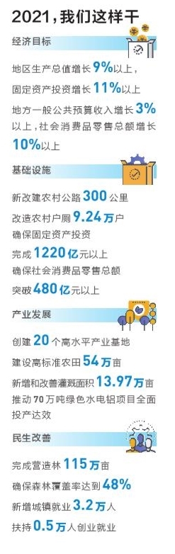 本报记者 谢毅 蔡侯友 沈迅 新开局、新征程、新气象。2021年是开启全面建设社会主义现代化新征程的开局之年,是伟大的中国共产党建党100周年。做好今年的工作,意义重大,使命光荣。 高瞻远瞩绘就宏伟蓝图,砥砺奋进谱写发展新篇。要让蓝图变为现实,必须把全社会的热情和干劲充分激发出来,紧盯目标、脚踏实地,画出共同奋斗的 “同心圆”,推动“大美昭通”高质量发展超越迈上新台阶。 1 巩固拓展脱贫攻坚成果 接续实施乡村振兴战略 关键词:农村低收入人口 ——紧盯农村低收入人口,加强动态监测和精准帮扶,确保农村低收入人口“两不愁三保障”问题及时发现、及时帮扶、及时清零。落实稳岗就业协作机制,突出特殊困难群体就业帮扶,实现农村劳动力转移就业率稳中有升。 关键词:脱贫村提升行动 ——实施脱贫村提升行动,新改建农村公路300公里,硬化自然村道路1600公里,完成安保工程1600公里。改造农村户厕9.24万户。推进农网改造升级。高标准打造1至两个省级乡村振兴示范园,谋划建设10个市级以上乡村振兴示范乡(镇)、100个精品示范村,实施一批美丽村庄建设。 关键词:易地扶贫搬迁后续扶持 ——强化易地扶贫搬迁后续扶持,全力争取政策项目资金支持,完善公共配套设施,加强社区治理和精神文明建设,让搬迁群众安居乐业。加强扶贫资产管理,依托60万平方米扶贫车间,整合公共资源,盘活140.8万亩“三块地”,引进和培育劳动密集型产业,持续增加搬迁群众收益。 2 积极扩大有效需求 推动经济平稳健康发展 关键词:稳增长政策 ——认真落实国家和省一揽子稳增长政策,实行“一企一策”精准帮扶,推动减税降费、财政奖补等“政策红包”落地见效,助力市场主体纾困发展。做好“六稳”工作,落实“六保”任务,促进经济高开稳走、稳健运行。 关键词:“双十”重大工程 ——以“双十”重大工程为引领,实施重大项目建设攻坚行动,建立重大项目协调推进机制,大抓项目,抓好项目,确保固定资产投资完成1220亿元以上。加大经费投入力度,支持交通、农业、水利、社会事业等重点项目前期工作。促进民间投资复苏回暖,力争增长20%以上。 关键词:新消费行动计划 ——实施培育新消费行动计划,确保社会消费品零售总额突破480亿元以上。合理增加公共消费,扩大县乡消费和城市中低收入群体消费。鼓励各县(市、区)打造两个以上特色商业街区,活跃夜间经济、体验经济等消费活动。 3 推进农业强市建设 提升高原特色产业发展水平 关键词:推动产业提质增效 ——落实“米袋子”“菜篮子”责任制,稳定756万亩粮食播种面积。创建20个高水平产业基地,新植苹果9万亩、规范化管护33.5万亩、提质增效改造老果园11.5万亩,确保竹子种植面积增加到530万亩,抓好14.2万亩“洋芋帝国”建设,推动食用菌、天麻、花椒等产业提质增效。加快推进生猪、肉牛标准化规模化养殖,出栏生猪523.9万头、肉牛20万头。完成烤烟收购66万担。 关键词:土地整治 ——继续推进土地整治和中低产田地改造,建设高标准农田54万亩。大力发展农业高效节水灌溉,新增和改善灌溉面积13.97万亩。新开工建设14座重点水源工程,实现6座水库下闸蓄水,持续巩固提升农村饮水安全。 关键词:高原特色产业标准体系 ——建立高原特色产业标准体系,新认证“三品一标”产品85个,加快培育一批昭通区域公共品牌。引进和培育市级以上农业龙头企业10家,力争培育年销售额超亿元的“农业小巨人”两户。加强农民专业合作社规范管理,评选市级以上示范社30家,引领带动合作社健康发展。 4 大力发展绿色能源产业 促进工业经济转型升级 关键词:绿色能源 ——推动70万吨绿色水电铝项目全面投产达效,力争引进两个以上精深加工项目落地。加快绿色水电硅循环经济项目建设,推动一期40万吨工业硅建成投产,完成40万吨有机硅主体工程建设。加大页岩气勘探开发力度,实现产气1.5亿立方米。 关键词:工业经济转型升级 ——完成煤炭企业整治重组,推进煤矿“五化”改造,促进煤炭产业转型升级发展。加大镇雄磷矿资源开发前期工作力度。鼓励化工等传统产业绿色低碳技改。 ——健全管理运行、服务保障机制,推动省级开发区创新提质发展,力争引进10个产业项目落地园区,实现园区工业增加值210亿元以上。 5 推动旅游业高质量发展 培育壮大现代服务业 关键词:服务业提升行动 ——实施服务业提升行动,推进服务业标准化建设,促进现代物流、电子商务、中介咨询、康养休闲等新兴产业提速发展。完善政策措施,鼓励和支持企业升规纳限,实现服务业增长12%以上。 关键词:“旅游革命” ——深化“旅游革命”,实施“三年行动计划”,抓好长征国家文化公园昭通段建设,推进威信水田、绥江水上运动赛事基地和镇雄小山峡、水富大峡谷、彝良小草坝5个省级文旅项目建设,启动2个3A级景区智慧化建设,创建3A级景区5个,实现旅游总收入250亿元以上。 关键词:金融服务 ——积极引进股份制商业银行在昭通设立分支机构,完善政银企常态化沟通机制,鼓励金融机构创新信贷模式和产品,力争贷款余额增长15%以上。创新保险业合作发展机制,助推产业做强做大。提高金融监管质效,严厉打击非法金融活动,有效防范和化解金融风险。 6 保持综合交通建设会战态势 持续改善发展条件 关键词:能通全通、互联