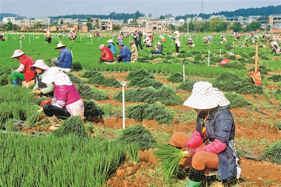 连日来,泸西县的小香葱种植基地里一片繁忙景象,当地群众忙着在田里拔葱、分拣、装运上车。 “自从2016年泸西成为杭州G20峰会蔬菜供应基地以来,蔬菜成为我们响当当的品牌。”云南绿园农业开发公司总经理蔡安育介绍,“公司每天有150吨蔬菜销往全国各地,基地、加工区、制冷系统、清洗区常年提供460多人的岗位。” 泸西县是全国最大的小香葱生产基地,蔬菜种植面积达20余万亩,蔬菜销往香港、上海、广州等地,产值突破30亿元,务工农户达16万户。 近年来,泸西县加快发展高原特色现代农业,引导农户自愿以土地资源折资、现金入股等方式加入服务社,形成“党总支+合作社联农户连龙头企业”的“村社合一、社企互融”模式,实现新型农村合作经济组织带动贫困户全覆盖,推动产业发展、农户增收。 通过土地流转、投资建设基础设施,泸西县先后培育和引进了浙江海亮、深圳果蔬等蔬菜公司。去年全县蔬菜基地面积达19万亩,上市商品量达165万吨。 本报记者 李树芬 通讯员 赵江洪