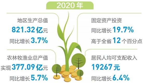 本报讯 (记者 李春林 吴沛钊) 去年,面对严峻复杂的国内外环境、新冠肺炎疫情的严重冲击、经济下行的严峻考验等多重因素叠加影响,临沧市统筹推进疫情防控和经济社会发展工作,经济社会发展呈现经济稳定增长、民生持续改善、环境更加优越、社会和谐稳定的良好态势。 根据地区生产总值统一核算结果,2020年全市地区生产总值达821.32亿元,同比增长3.7%。其中:第一产业增加值242.34亿元,同比增长5.7%;第二产业增加值203.84亿元,同比增长1.4%;第三产业增加值375.14亿元,同比增长3.9%。 农业生产平稳增长。去年,全市农林牧渔业总产值实现377.09亿元,同比增长5.7%。全年粮食播种面积预计432.09万亩,比上年增加0.1万亩;粮食产量预计104万吨,比上年增加1.33万吨,同比增长1.3%,粮食生产有望实现“十三连增”。 工业生产出现负增长,电力生产和供应业较快恢复。去年,全市规模以上工业增加值同比下降4.3%,降幅比前三季度收窄4.9个百分点。从全部22个行业看,增长的行业有6个,下降的行业有16个。增长较快的行业是计算机、通信和其他电子设备制造,同比增长75.5%;木材加工和木、竹、藤、棕、草制造业同比增长18.6%;非金属矿采选业同比增长11.6%。 固定资产投资成效显著。去年,全市固定资产投资同比增长19.7%,高于全省12个百分点,增速排名全省第二位。其中,项目投资同比增长19.3%,房地产开发投资同比增长21.9%。从在建项目来看,2020年在建项目701个,较去年同期增加116个;新开工项目314个,较去年同期增加148个。 市场消费持续回暖,住宿、餐饮业回升较为明显。去年,全市社会消费品零售总额317.02亿元,同比下降6.3%,降幅比前三季度收窄0.9个百分点。从市场销售情况看,住宿业营业额14.42亿元,同比下降15.8%,降幅比前三季度收窄8.8个百分点;餐饮业营业额49.11亿元,同比下降9.1%,降幅比前三季度收窄5.6个百分点。 财政运行稳中向好,收支实现双增长。去年,全市地方一般公共预算收入完成47.92亿元,同比增长3.1%。地方一般公共预算支出完成276.88亿元,同比增长1%。面对财政收支压力,一方面,政府过“紧日子”,相关支出下降;另一方面,农林水、交通运输、卫生健康、住房保障等民生支出均呈现增长,助力人民过上好日子。其中,农林水支出增长40.1%、交通运输支出增长259.4%、卫生健康支出增长14.8%、住房保障支出增长271.7%、灾害防治应急管理支出增长106.9%。 金融市场运行平稳。去年12月末,全市金融机构人民币存款余额798.15亿元,同比增长15.4%,比年初增加106.48亿元,连续4个季度排名全省第一位。全市金融机构人民币贷款余额629.85亿元,同比增长10.7%,比年初增加60.93亿元。 居民收入与经济同步增长。2020年,临沧市全体居民人均可支配收入19267元,同比增长6.4%,增速排全省第二位。按常住地分,城镇常住居民人均可支配收入30794元,同比增长4.3%,增速排全省第一位;农村常住居民人均可支配收入12824元,同比增长7.7%,增速排全省第八位。 进出口贸易持续恢复。去年,全市完成进出口总额54.88亿元,同比下降9.6%。其中,出口完成19.38亿元,同比增长0.9%。