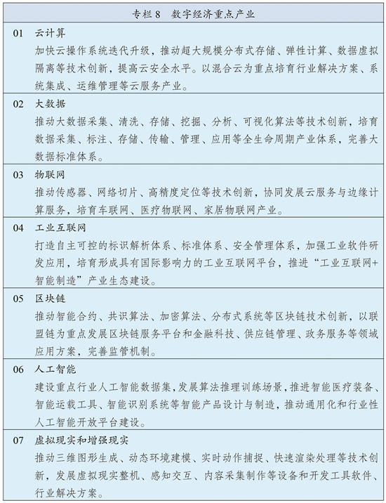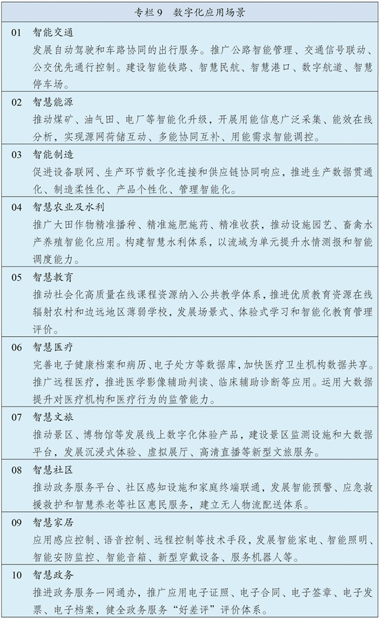 上接第六版 加快发展智慧农业,推进农业生产经营和管理服务数字化改造。 (接专栏8) 第十六章 加快数字社会建设步伐 适应数字技术全面融入社会交往和日常生活新趋势,促进公共服务和社会运行方式创新,构筑全民畅享的数字生活。 第一节 提供智慧便捷的公共服务 聚焦教育、医疗、养老、抚幼、就业、文体、助残等重点领域,推动数字化服务普惠应用,持续提升群众获得感。推进学校、医院、养老院等公共服务机构资源数字化,加大开放共享和应用力度。推进线上线下公共服务共同发展、深度融合,积极发展在线课堂、互联网医院、智慧图书馆等,支持高水平公共服务机构对接基层、边远和欠发达地区,扩大优质公共服务资源辐射覆盖范围。加强智慧法院建设。鼓励社会力量参与“互联网+公共服务”,创新提供服务模式和产品。 第二节 建设智慧城市和数字乡村 以数字化助推城乡发展和治理模式创新,全面提高运行效率和宜居度。分级分类推进新型智慧城市建设,将物联网感知设施、通信系统等纳入公共基础设施统一规划建设,推进市政公用设施、建筑等物联网应用和智能化改造。完善城市信息模型平台和运行管理服务平台,构建城市数据资源体系,推进城市数据大脑建设。探索建设数字孪生城市。加快推进数字乡村建设,构建面向农业农村的综合信息服务体系,建立涉农信息普惠服务机制,推动乡村管理服务数字化。 第三节 构筑美好数字生活新图景 推动购物消费、居家生活、旅游休闲、交通出行等各类场景数字化,打造智慧共享、和睦共治的新型数字生活。推进智慧社区建设,依托社区数字化平台和线下社区服务机构,建设便民惠民智慧服务圈,提供线上线下融合的社区生活服务、社区治理及公共服务、智能小区等服务。丰富数字生活体验,发展数字家庭。加强全民数字技能教育和培训,普及提升公民数字素养。加快信息无障碍建设,帮助老年人、残疾人等共享数字生活。 第十七章 提高数字政府建设水平 将数字技术广泛应用于政府管理服务,推动政府治理流程再造和模式优化,不断提高决策科学性和服务效率。 第一节 加强公共数据开放共享 建立健全国家公共数据资源体系,确保公共数据安全,推进数据跨部门、跨层级、跨地区汇聚融合和深度利用。健全数据资源目录和责任清单制度,提升国家数据共享交换平台功能,深化国家人口、法人、空间地理等基础信息资源共享利用。扩大基础公共信息数据安全有序开放,探索将公共数据服务纳入公共服务体系,构建统一的国家公共数据开放平台和开发利用端口,优先推动企业登记监管、卫生、交通、气象等高价值数据集向社会开放。开展政府数据授权运营试点,鼓励第三方深化对公共数据的挖掘利用。 第二节 推动政务信息化共建共用 加大政务信息化建设统筹力度,健全政务信息化项目清单,持续深化政务信息系统整合,布局建设执政能力、依法治国、经济治理、市场监管、公共安全、生态环境等重大信息系统,提升跨部门协同治理能力。完善国家电子政务网络,集约建设政务云平台和数据中心体系,推进政务信息系统云迁移。加强政务信息化建设快速迭代,增强政务信息系统快速部署能力和弹性扩展能力。 第三节 提高数字化政务服务效能 全面推进政府运行方式、业务流程和服务模式数字化智能化。深化“互联网+政务服务”,提升全流程一体化在线服务平台功能。加快构建数字技术辅助政府决策机制,提高基于高频大数据精准动态监测预测预警水平。强化数字技术在公共卫生、自然灾害、事故灾难、社会安全等突发公共事件应对中的运用,全面提升预警和应急处置能力。 第十八章 营造良好数字生态 坚持放管并重,促进发展与规范管理相统一,构建数字规则体系,营造开放、健康、安全的数字生态。 第一节 建立健全数据要素市场规则 统筹数据开发利用、隐私保护和公共安全,加快建立数据资源产权、交易流通、跨境传输和安全保护等基础制度和标准规范。建立健全数据产权交易和行业自律机制,培育规范的数据交易平台和市场主体,发展数据资产评估、登记结算、交易撮合、争议仲裁等市场运营体系。加强涉及国家利益、商业秘密、个人隐私的数据保护,加快推进数据安全、个人信息保护等领域基础性立法,强化数据资源全生命周期安全保护。完善适用于大数据环境下的数据分类分级保护制度。加强数据安全评估,推动数据跨境安全有序流动。 第二节 营造规范有序的政策环境 构建与数字经济发展相适应的政策法规体系。健全共享经济、平台经济和新个体经济管理规范,清理不合理的行政许可、资质资格事项,支持平台企业创新发展、增强国际竞争力。依法依规加强互联网平台经济监管,明确平台企业定位和监管规则,完善垄断认定法律规范,打击垄断和不正当竞争行为。探索建立无人驾驶、在线医疗、金融科技、智能配送等监管框架,完善相关法律法规和伦理审查规则。健全数字经济统计监测体系。 第三节 加强网络安全保护 健全国家网络安全法律法规和制度标准,加强重要领域数据资源、重要网络和信息系统安全保障。建立健全关键信息基础设施保护体系,提升安全防护和维护政治安全能力。加强网络安全风险评估和审查。加强网络安全基础设施建设,强化跨领域网络安全信