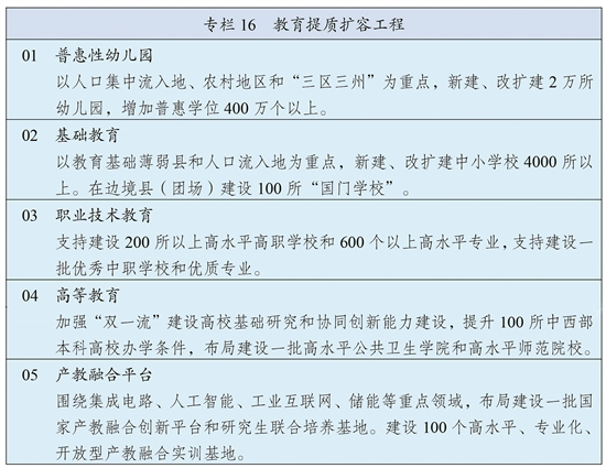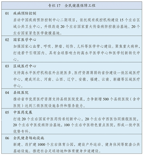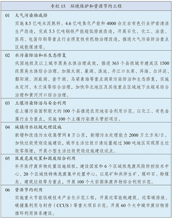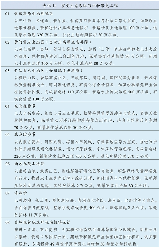 上接第八版 第十一篇 推动绿色发展促进人与自然和谐共生 坚持绿水青山就是金山银山理念,坚持尊重自然、顺应自然、保护自然,坚持节约优先、保护优先、自然恢复为主,实施可持续发展战略,完善生态文明领域统筹协调机制,构建生态文明体系,推动经济社会发展全面绿色转型,建设美丽中国。 第三十七章 提升生态系统质量和稳定性 坚持山水林田湖草系统治理,着力提高生态系统自我修复能力和稳定性,守住自然生态安全边界,促进自然生态系统质量整体改善。 第一节 完善生态安全屏障体系 强化国土空间规划和用途管控,划定落实生态保护红线、永久基本农田、城镇开发边界以及各类海域保护线。以国家重点生态功能区、生态保护红线、国家级自然保护地等为重点,实施重要生态系统保护和修复重大工程,加快推进青藏高原生态屏障区、黄河重点生态区、长江重点生态区和东北森林带、北方防沙带、南方丘陵山地带、海岸带等生态屏障建设。加强长江、黄河等大江大河和重要湖泊湿地生态保护治理,加强重要生态廊道建设和保护。全面加强天然林和湿地保护,湿地保护率提高到55%。科学推进水土流失和荒漠化、石漠化综合治理,开展大规模国土绿化行动,推行林长制。科学开展人工影响天气活动。推行草原森林河流湖泊休养生息,健全耕地休耕轮作制度,巩固退耕还林还草、退田还湖还湿、退围还滩还海成果。 (图7见11版) 第二节 构建自然保护地体系 科学划定自然保护地保护范围及功能分区,加快整合归并优化各类保护地,构建以国家公园为主体、自然保护区为基础、各类自然公园为补充的自然保护地体系。严格管控自然保护地范围内非生态活动,稳妥推进核心区内居民、耕地、矿权有序退出。完善国家公园管理体制和运营机制,整合设立一批国家公园。实施生物多样性保护重大工程,构筑生物多样性保护网络,加强国家重点保护和珍稀濒危野生动植物及其栖息地的保护修复,加强外来物种管控。完善生态保护和修复用地用海等政策。完善自然保护地、生态保护红线监管制度,开展生态系统保护成效监测评估。 第三节 健全生态保护补偿机制 加大重点生态功能区、重要水系源头地区、自然保护地转移支付力度,鼓励受益地区和保护地区、流域上下游通过资金补偿、产业扶持等多种形式开展横向生态补偿。完善市场化多元化生态补偿,鼓励各类社会资本参与生态保护修复。完善森林、草原和湿地生态补偿制度。推动长江、黄河等重要流域建立全流域生态补偿机制。建立生态产品价值实现机制,在长江流域和三江源国家公园等开展试点。制定实施生态保护补偿条例。 (接专栏14) 第三十八章 持续改善环境质量 深入打好污染防治攻坚战,建立健全环境治理体系,推进精准、科学、依法、系统治污,协同推进减污降碳,不断改善空气、水环境质量,有效管控土壤污染风险。 第一节 深入开展污染防治行动 坚持源头防治、综合施策,强化多污染物协同控制和区域协同治理。加强城市大气质量达标管理,推进细颗粒物(PM2.5)和臭氧(O3)协同控制,地级及以上城市PM2.5浓度下降10%,有效遏制O3浓度增长趋势,基本消除重污染天气。持续改善京津冀及周边地区、汾渭平原、长三角地区空气质量,因地制宜推动北方地区清洁取暖、工业窑炉治理、非电行业超低排放改造,加快挥发性有机物排放综合整治,氮氧化物和挥发性有机物排放总量分别下降10%以上。完善水污染防治流域协同机制,加强重点流域、重点湖泊、城市水体和近岸海域综合治理,推进美丽河湖保护与建设,化学需氧量和氨氮排放总量分别下降8%,基本消除劣Ⅴ类国控断面和城市黑臭水体。开展城市饮用水水源地规范化建设,推进重点流域重污染企业搬迁改造。推进受污染耕地和建设用地管控修复,实施水土环境风险协同防控。加强塑料污染全链条防治。加强环境噪声污染治理。重视新污染物治理。 第二节 全面提升环境基础设施水平 构建集污水、垃圾、固废、危废、医废处理处置设施和监测监管能力于一体的环境基础设施体系,形成由城市向建制镇和乡村延伸覆盖的环境基础设施网络。推进城镇污水管网全覆盖,开展污水处理差别化精准提标,推广污泥集中焚烧无害化处理,城市污泥无害化处置率达到90%,地级及以上缺水城市污水资源化利用率超过25%。建设分类投放、分类收集、分类运输、分类处理的生活垃圾处理系统。以主要产业基地为重点布局危险废弃物集中利用处置设施。加快建设地级及以上城市医疗废弃物集中处理设施,健全县域医疗废弃物收集转运处置体系。 第三节 严密防控环境风险 建立健全重点风险源评估预警和应急处置机制。全面整治固体废物非法堆存,提升危险废弃物监管和风险防范能力。强化重点区域、重点行业重金属污染监控预警。健全有毒有害化学物质环境风险管理体制,完成重点地区危险化学品生产企业搬迁改造。严格核与辐射安全监管,推进放射性污染防治。建立生态环境突发事件后评估机制和公众健康影响评估制度。在高风险领域推行环境污染强制责任保险。 第四节 积极应对气候变化 落实2030年应对气候变化国家自主贡献目标,制定2030年前碳排放达峰行动方案。完善能源消费总量和强度双控制度,重点控制化石能源消费。实施以碳强度控制为主、碳排放总