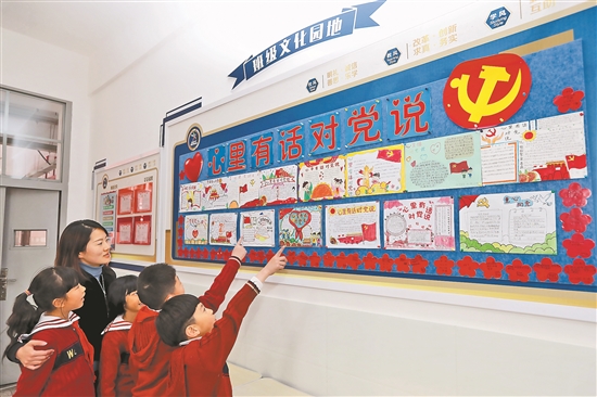新学期开学以来,昆明市五华区武成教育集团各校区统一开展以“学党史 感党恩 听党话 跟党走”为主题的系列教育活动,积极引导学生了解党史,讴歌颂扬中国共产党的丰功伟绩,传承红色基因,争做时代新人。图为在武成教育集团人民路校区,各班级把同学们学习党史的心得体会通过“心里有话对党说”专题板报的形式进行展示。