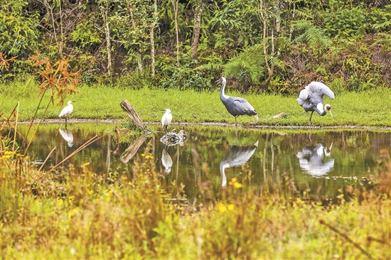 郁郁葱葱,鸟叫蝉鸣。顺着思小高速向南前行,“沿着高速看中国·走进云南”记者团一行驶入了太阳河自然保护地。 这里毗邻昆曼高速公路大通道,由相连的太阳河省级自然保护区和太阳河国家森林公园两部分组成,保存着全球同纬度地带热带向南亚热带过渡的面积最大、最集中连片的季风常绿阔叶林。森林覆盖率高达98.8%,生物多样性极其丰富,有高等植物2100多种、鸟类230多种、兰科植物240多种,堪称“兰花的世界、鸟类的天堂”、最耀眼的“绿海明珠”。 进入太阳河国家森林公园,满目翠绿应接不暇。沿着生态走廊步行,一路上都能听到长臂猿啼鸣,沿途都是数不清的珍稀植物,还能体验到给犀牛挠痒痒,和小熊猫合影,喂食小猴子,看猫头鹰睡觉等近距离接触项目。 行至茭瓜塘湿地,动物观察员鲁梅正在给湿地里的鸟类喂食。“你看那只白一些的是白枕鹤,灰色羽毛的是灰鹤,还有一只是国家一级保护动物东方白鹳。”鲁梅对湿地的动物了如指掌。她告诉记者,这片湿地因附近居民曾经在这里大量种植茭瓜而得名。随着对森林生态保护力度的加大,村民逐渐退出这片传统活动区域,现在这里野花野草肆意生长,白枕鹤、灰鹤悠然漫步。在太阳河国家森林公园,这样人与自然和谐相处的画面随处可见。 为了让大家对“北回归线上最大的绿洲”有个形象的认识,太阳河国家森林公园管理局局长张登林拿出了一幅地图,向记者们介绍普洱市的林业特点。第一是大,普洱市国土面积、森林面积、人均林地面积、森林蓄积量、湿地面积都是全省最大。第二是多,全市动植物种类繁多,生物多样性极其丰富,是“七彩云南”丰富性和多样性的样板。第三是强,全市林产业从无到有、从小到大、从弱到强,门类齐全,初具规模,初步形成了一、二、三产业融合发展的林产业体系。 普洱林业“大、多、强”的特点,造就了普洱市生态环境良好,生物多样性丰富,太阳河自然保护地就是最形象的缩影。多年来,通过建立完善网格化管理机制,在保护中发展、在发展中保护,生态安全屏障作用有效发挥,森林生态旅游蓬勃发展,成功创建为国家4A级景区,描绘了思小高速公路上浓墨重彩的一笔。 “随着太阳河国家森林公园不断发展,我们也在转变经营思路,在传统旅游的基础上,积极拓展旅游产品外延,开展森林+休闲养生度假产业集群,利用森林+生态康养、国际赛事、自然研学游学、汽车试驾等,与健康、体育、文化、教育领域共融发展,围绕森林旅游探索出一条保护自然与普惠社会的旅游可持续发展之路。”张登林说。 本报记者 李承韩
