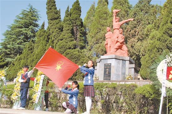 上午9时,900余名少先队员及党员干部来到青山烈士陵园,在英雄雕像前整齐列队,全场肃立,奏唱中华人民共和国国歌,向为中国人民的解放事业和共和国建设事业英勇献身的烈士默哀。随后,全体人员缓步绕行瞻仰烈士纪念碑,向革命先烈鞠躬敬礼并敬献鲜花。讲解员还为党员干部、少先队员讲解了陆良革命斗争史。