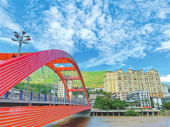 傍晚,怒江傈僳族自治州交通运输局干部、摄影爱好者新跃华来到六库老城区攀枝花古渡口,支起脚架,拍摄夜幕下的中交怒江连心桥。 镜头下的连心桥,灯光璀璨,庞大的桥身如巨龙出海般飞跃滚滚怒江,将瓦碧公路与六库老城区串联成线;桥的两岸,滨江走廊杨柳依依,叶子花红,暖风习习;桥上,车辆疾驰,游人如织。“连心桥造型独特,像长虹卧江,与两岸景色浑然一体,非常美丽壮观,已经成为六库城市的地标和网红打卡地。”新跃华说。 泸水市六库镇是泸水市委市政府及六库镇党委镇政府所在地。这里,两山对峙,一江穿城。涛涛怒江,将六库城市分成了东、西两个城区。受特殊的地形地貌和历史因素影响,老城区只有东西两条出城道路,两条道路仅有修建于上世纪九十年代的怒江大桥和2014年建成的通达桥跨江相连。 伴随着怒江经济社会的跨越发展,特别是城市居民逐年增加,六库城市仅有的连接东西城区的两座跨江桥梁不堪重负,车流量最多的怒江大桥,多次封闭检修,城区拥堵痼疾越来越重。 再建一座跨江大桥,分流城区车辆,优化城市交通网络、改善当地群众生产生活条件、提升城市形象,解决堵车、过江难痼疾,已成为六库城市建设中的迫切需求。 2018年8月8日,六库市民期盼多年的第三座过江大桥破土动工。这座由中交集团援建、中交三公局总承包修建的跨江大桥取名“中交怒江连心桥”,寓意中交集团与怒江各族人民心连心,同甘共苦,团结奋进。 自1995年挂联帮扶怒江以来,中国交通建设集团有限公司(简称中交集团)聚力交通、搬迁、产业、教育、就业、党建脱贫等领域,真金白银,久久为功,一心一意帮助怒江打赢深度贫困脱贫攻坚战,让怒江各族人民过上好日子。修建连心桥,正是中交集团着眼于六库城市长远发展需求,助力怒江新城加快发展步伐而实施的交通重点帮扶项目。 中交怒江连心桥位于六库城市老城区古渡口。大桥横跨怒江,连接重阳路和渡口路,路线全长310米,平面线型为直线,其中桥梁全长196米,两岸连接线引道 114 米,桥面布置为双向两车道,主桥采用一跨过江的钢箱梁下承式提篮拱,主桥跨径144米,单跨顶推100米,是亚洲单跨顶推跨径最大的桥梁,总投资1.04亿元。 2020年8月12日,中交怒江连心桥建成通车。市民闻声而至,载歌载舞,庆祝这一美好时刻。本报记者 李寿华