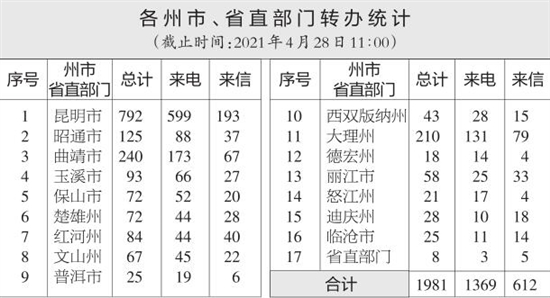 本报讯 4月28日上午,中央第八生态环境保护督察组(以下简称“督察组”)向我省交办第二十二批群众举报投诉生态环境问题131件(来电66件、来信65件),涉及16个州(市)。其中,昆明市54件,大理州14件,曲靖市12件,玉溪市10件,楚雄州7件,保山市6件,昭通市、丽江市、普洱市、德宏州各4件,西双版纳州、怒江州各3件,文山州、临沧市各2件,红河州、迪庆州各1件。省迎接中央生态环境保护督察工作领导小组边督边改组第一时间将交办件全部转相关州(市)进行办理。 截至4月28日上午11∶00,督察组交办群众举报投诉生态环境问题共二十二批1981件(来电1369件、来信612件)。其中,昆明市792件,曲靖市240件,大理州210件,昭通市125件,玉溪市93件,红河州84件,保山市72件,楚雄州72件,文山州67件,丽江市58件,西双版纳州43件,迪庆州28件,临沧市25件,普洱市25件,怒江州21件,德宏州18件,省直部门直接办理8件。 我省高度重视督察组交办的群众信访举报件,及时提出办结要求,建立工作机构,健全边督边改工作机制,成立转办、督办、分析研判、信息汇总等小组,及时将督察组交办的举报件向有关州(市)及相关省直部门转办,对重点关注、群众反复举报的派出现场组进行现场督办。截至4月28日,第一批至第十三批来电来信举报924件,已办结545件,阶段性办结118件,未办结261件;按核实情况统计,属实192件,基本属实69件,部分属实520件,不属实143件;责令整改649家,立案处罚262家,罚款金额836.5万元,立案侦查1件,约谈213人,问责9人。 省迎接中央生态环境保护督察工作领导小组边督边改组将分批公开督察组交办我省的群众举报投诉生态环境问题的受理、办理和整改情况。可登录云南省人民政府网站(http://www.yn.gov.cn/ztgg/hbdc/)查阅群众信访举报转办和边督边改公开情况一览表。 中央第八生态环境保护督察组 督察云南省进驻时间:1个月 进驻期间:2021年4月6日-5月6日 专门值班电话:0871-68599800 专门邮政信箱:云南省昆明市A005号邮政信箱 督察组受理举报电话时间:每天8:00-20:00