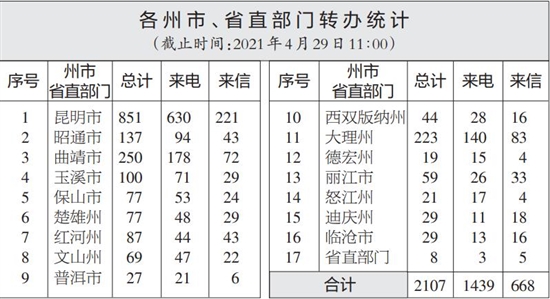 本报讯 4月29日上午,中央第八生态环境保护督察组(以下简称“督察组”)向我省交办第二十三批群众举报投诉生态环境问题126件(来电70件、来信56件),涉及15个州(市)。其中,昆明市59件,大理州13件,昭通市12件,曲靖市10件,玉溪市7件,楚雄州、保山市各5件,临沧市4件,红河州3件,普洱市、文山州各2件,西双版纳州、丽江市、德宏州、迪庆州各1件,怒江州当日无举报件。省迎接中央生态环境保护督察工作领导小组边督边改组第一时间将交办件全部转相关州(市)进行办理。 截至4月29日上午11∶00,督察组交办群众举报投诉生态环境问题共二十三批2107件(来电1439件、来信668件)。其中,昆明市851件,曲靖市250件,大理州223件,昭通市137件,玉溪市100件,红河州87件,保山市77件,楚雄州77件,文山州69件,丽江市59件,西双版纳州44件,迪庆州29件,临沧市29件,普洱市27件,怒江州21件,德宏州19件,省直部门直接办理8件。 我省高度重视督察组交办的群众信访举报件,及时提出办结要求,建立工作机构,健全边督边改工作机制,成立转办、督办、分析研判、信息汇总等小组,及时将督察组交办的举报件向有关州(市)及相关省直部门转办,对重点关注、群众反复举报的派出现场组进行现场督办。截至4月29日,第一批至第十四批来电来信举报1036件,已办结609件,阶段性办结137件,未办结290件;按核实情况统计,属实214件,基本属实79件,部分属实589件,不属实154件;责令整改726家,立案处罚274家,罚款金额874.35万元,立案侦查1件,约谈215人,问责9人。 省迎接中央生态环境保护督察工作领导小组边督边改组将分批公开督察组交办我省的群众举报投诉生态环境问题的受理、办理和整改情况。可登录云南省人民政府网站(http://www.yn.gov.cn/ztgg/hbdc/)查阅群众信访举报转办和边督边改公开情况一览表。 中央第八生态环境保护督察组 督察云南省进驻时间:1个月 进驻期间:2021年4月6日-5月6日 专门值班电话:0871-68599800 专门邮政信箱:云南省昆明市A005号邮政信箱 督察组受理举报电话时间:每天8:00-20:00