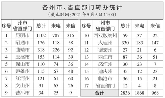 本报讯 5月5日上午,中央第八生态环境保护督察组(以下简称“督察组”)向我省交办第二十九批群众举报投诉生态环境问题113件(来电75件、来信38件),涉及15个州(市);其中,昆明市34件,大理州19件,曲靖市、玉溪市、红河州各9件,楚雄州8件,丽江市6件,昭通市4件,保山市、文山州、怒江州各3件,西双版纳州、临沧市各2件,普洱市、德宏州各1件,迪庆州当日无举报投诉件。省迎接中央生态环境保护督察工作领导小组边督边改组第一时间将交办件全部转相关州(市)进行办理。 截至5月5日上午11:00,督察组交办群众举报投诉生态环境问题共二十九批2836件(来电1868件、来信968件);其中,昆明市1102件,大理州330件,曲靖市318件,昭通市176件,玉溪市153件,红河州121件,楚雄州115件,保山市110件,文山州91件,丽江市87件,西双版纳州59件,临沧市36件,迪庆州35件,普洱市34件,怒江州30件,德宏州27件,省直部门直接办理12件。 我省高度重视督察组交办的群众举报投诉件,及时提出办结要求,建立工作机构,健全边督边改工作机制,成立转办、督办、分析研判、信息汇总等小组,及时将督察组交办的举报投诉件向有关州(市)及相关省直部门转办,对重点关注、群众反复举报投诉的派出现场组进行现场督办。截至5月5日,第一批至第二十批举报投诉1725件,已办结989件,阶段性办结241件,未办结495件;按核实情况统计,属实351件,基本属实131件,部分属实999件,不属实244件;责令整改1010家,立案处罚365家,罚款金额1265.93万元,立案侦查3件,约谈255人,问责9人。 省迎接中央生态环境保护督察工作领导小组边督边改组将分批公开督察组交办我省的群众举报投诉生态环境问题的受理、办理和整改情况。可登录云南省人民政府网站 (http://www.yn.gov.cn/ztgg/hbdc/)查阅群众信访举报转办和边督边改公开情况一览表。 中央第八生态环境保护督察组 督察云南省进驻时间:1个月 进驻期间:2021年4月6日-5月6日 专门值班电话:0871-68599800 专门邮政信箱:云南省昆明市A005号邮政信箱 督察组受理举报电话时间:每天8:00-20:00