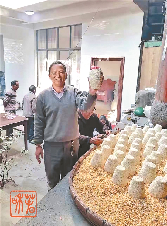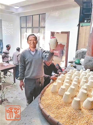 □蔺应菊/文 熊国菊 林宁/摄 腾冲春节,家家户户都要购买米花糖,以图喜庆吉祥,因此腾冲米花糖又叫“欢喜团”。从我记事起,每年除夕之夜家中天地牌位前的正中位置,都供着一个米花糖,一直要供到正月十六(即小年)后才能分食。孩童的意志力在香脆的米花糖面前,是经不住甜蜜诱惑的,还好那时的米花糖经不住长时间摆放,遇到冷风一吹就会受潮变软,长辈们说这是米花糖“笑”了。其实,笑的何止是米花糖,还有孩童们那开心、期待的笑。 每逢米花糖“笑”时,孩童们的秘密行动也就开始了——通常会用手把软掉的米花抠下来解馋,抠不动的,就趁大人不在家时,用小刀从米花糖底部整齐的慢慢切割,一个高约20厘米的米花糖,就在不经意间越变越矮,呈现出各种姿态。忆及童年对米花糖的渴盼,现在回忆中仍是满满的甜蜜。 腾冲界头镇永安街,制作米花糖历史悠久,几百年一直传承至今。当地传说,界头米花糖的来历与一位戍边大将有关,百姓为了纪念这位将军,就在每年春节时用泡米做成米花糖,以表达对他的感恩与思念,如同端午节的粽子之于屈原一样。自古忠臣路难行,但心系天下苍生造福百姓的人,终将以某一种物像活在人们心中。 随着时代的变迁,加之米花糖生意的时节性太强,很多制作米花糖的人改行了,尤其是年青一代,对传统手工米花糖的制作望而却步。值得庆幸的是,界头镇永安街熊家寨的熊德贵、郭金荣两户人家,以及桥头街上街社的林发祥夫妇,还在持之以恒地传承着这门传统手工技艺。 为了让米花糖能在除夕之夜前出现在千家万户,制作米花糖的几户人家,从农历十月就开始着手准备了: 第一步:炒制米花。米花以上好的糯米为材料,用大盆或土陶罐、土陶缸等器物浸泡24小时,淘洗干净后用笊篱捞出置于簸箕内,放到没有阳光的地方自然风干,俗称“阴米”。晾干后的“阴米”需与干净的沙粒混合在一起用,温火炒至发泡成米花后,再用筛子将米花和沙粒分离,米花就制好了。 第二步:调制糖稀。糖稀是用麦芽糖熬制,这是米花糖制作工序中最关键的一环。先把糯米浸泡24小时,捞出沥干,蒸熟,将糯米饭放进温火烧热的大铁锅中加入水和一定比例的麦芽,充分搅拌后,在保持一定温度下发酵15个小时。等糯米饭与麦芽发酵后还需进行“干榨”,提取出汁水来,在火上熬煮4至5个小时,待水分彻底蒸发后,糖稀就算调制完成了。制作六七百个乃至上千个米花糖的糖稀,便是这样不厌其烦提取出来的,米花糖能“笑”或“不笑”,取决于熬制糖稀的浓度和柔韧度。 第三步:揉滚花糖。在没有目睹揉滚米花糖的手艺之前,我和多数人的猜想一致,妄自揣测米花糖之所以有型、美观,必定是用坛子、罐子等器物做模子,翻拓出来的。当主人为我播放揉滚米花糖的制作视频后,我被这门技艺震惊,为之瞠目结舌。揉滚米花糖需用米花和糖稀混合,糖稀要保持一定热度使其不凝固,还要随时准备好开水烫好的干净毛巾擦手用,以避免糖稀粘住手。花糖的大小、高矮、胖瘦均由米花的多少来决定,花糖滚出形状后,再加上“头红”(红色的米花),一个漂亮的米花糖就成型了。揉滚米花糖是一个最复杂、最热闹,也是最需要团结协作的过程,通常要全家总动员,或近邻互帮,因此制作米花糖的人家,大多家庭和睦、邻里亲近。长年揉滚过米花糖的双手,要么烫得通红、要么磨出水泡,要么长满老茧,十分辛苦。这门技艺,不仅是为了生计,也是对腾冲民俗文化的传承,以及对幸福生活的企盼与追求。看过这门手艺之后,我购买永安米花糖时,再也开不了口讨价还价了。如今的年货市场上,不乏机器制作的各色米花糖,但与巧手揉滚出的米花糖相比,机器制作的球形米花糖始终无法复制出永安米花糖的神韵。 第四步:巧手贴纸。揉滚好的米花糖,还需要贴纸。贴纸需要用麦面粉调好糨糊,然后根据花糖的高矮、形状,把特制的白纸裁成条状,涂上糨糊,逐条纵向粘在花糖上。贴纸的技术如果不好,会出现褶皱,破坏米花糖的感观和品相。贴纸看似简单,但要在短时间内为几百个乃至上千个米花糖贴纸,绝非易事。手艺熟练的贴纸师傅,那久经磨炼的纯熟技艺和淡定平和的气度,让人平添敬意。 第五步:喜庆画脸。画脸是米花糖制作过程中最复杂、最精细、最费时的一个环节,也是米花糖能够喜庆出彩的点睛之笔,成品销量的多寡与此密切相关。比较熟练的彩画师傅,一天能为20多个米花糖画彩妆,新手也能绘得10多个。为米花糖画脸的原材料很是讲究,需用栀子果水和白糖水,分别与红、黄、绿、黑四种颜色的颜料在热水锅中隔水加热调制而成。这些训练有素的彩画师傅,每人用纸包住一个米花糖,左手托稳放在膝盖上,右手执画笔,用火盆中热腾腾的彩色颜料根据花糖的形状和大小,在米花糖上彩绘“福”“招财进宝”“年年有余”“四季平安”等字样和图案,再用彩色颜料勾勒花边,突出喜庆吉祥的氛围。 每年农历腊月二十五左右,永安米花糖便在腾冲永安街、江苴街、曲石街等处的年货市场上隆重登场,一直卖到大年三十。腾冲人过年,家家户户都把米花糖供到正月十六,然后家人团聚分食。年年春节,米花糖总是与一家人朝夕相伴,为人们增添欢喜吉祥。 (作者单位:腾冲市教育体育局)