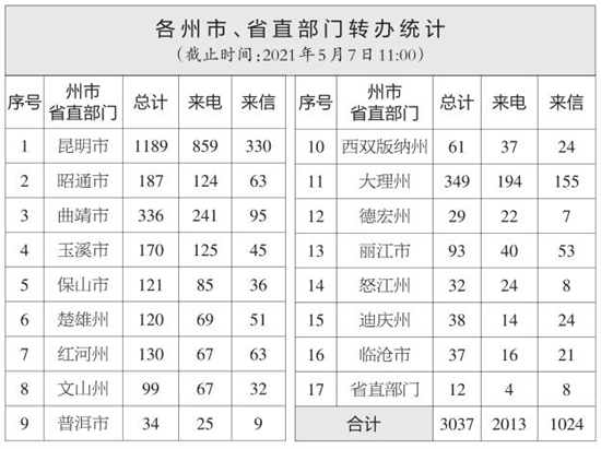 截至5月7日上午11:00,督察组交办群众举报投诉生态环境问题共三十一批3037件(来电2013件、来信1024件)。其中,昆明市1189件,大理州349件,曲靖市336件,昭通市187件,玉溪市170件,红河州130件,保山市121件,楚雄州120件,文山州99件,丽江市93件,西双版纳州61件,迪庆州38件,临沧市37件,普洱市34件,怒江州32件,德宏州29件,省直部门直接办理12件。
