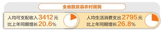 本报讯(记者 胡晓蓉) 5月5日,国家统计局云南调查总队发布对全省88个脱贫县组织实施的国家脱贫县农村住户监测调查结果显示:2021年一季度,全省脱贫县农村居民人均可支配收入3412元,比上年同期增长20.6%;人均生活消费支出2795元,比上年同期增长26.8%。 相关数据显示,一季度,全省脱贫县农村居民人均可支配收入比上年同期增加584元,增长20.6%,比全省农村居民人均可支配收入增速高0.4个百分点。 从收入来源结构看,工资性收入是脱贫县农村居民收入增长的主要动力。一季度云南脱贫县农村居民人均工资性收入1376元,比上年同期增加354元,增长34.6%,对增收的贡献达60.6%,拉动收入增长12.5个百分点。随着疫情防控效果的持续显现,脱贫县农村劳动力复工比上年同期提前,获得的工资收入明显增加。同时,省委、省政府倡导就地过年,对留岗工作人员给予经济补偿、发放留工福利、开放旅游文化资源等,员工到岗和企业开工的情况好于往年,助推工资收入大幅增加。 此外,农产品价格高位运行及消费扶贫助推经营净收入增长。一季度脱贫县农村居民人均经营净收入1234元,比上年增加158元,同比增长14.7%,对脱贫县农村居民增收的贡献率为27.1%,拉动收入增长5.6个百分点。与此同时,救济、补助及农村养老金提高促进转移净收入增长。一季度脱贫县农村居民人均转移净收入763元,比上年增加70元,同比增长10.2%,对脱贫县农村居民增收的贡献率为12%,拉动收入增长2.5个百分点。 从消费情况看,一季度,全省脱贫县农村居民人均生活消费支出2795元,比上年同期增加592元。总体来看,受疫情防控成效持续显现和春节假期的影响,居民消费的信心得到不断提振,市场呈现恢复性增长,全面带动了消费支出的增长。