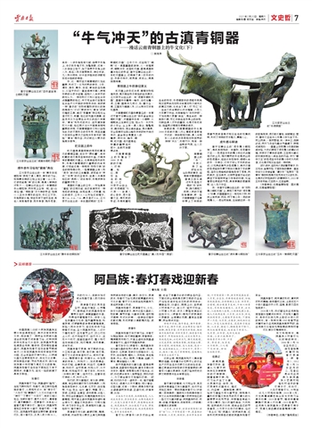 □ 曹先强 文/图 中国西南人口较少民族阿昌族主要分布在滇西地区,虽然没有本民族文字,却创造了一种民俗与民间戏曲结合的玩春灯迎新春习俗。这种独特的传统年俗文化活动,在阿昌族聚居地滇西梁河县、腾冲市、芒市等地普遍盛行。阿昌族玩春灯活动在春节期间举行,以祭祀阿昌族传说中保佑家财兴旺、五谷丰登的灯神为中心,以民间戏曲为主要表现形式,传统文化浓厚,民族特色浓郁,节庆气氛浓烈。因为受到族群分布环境及周边文化的影响,阿昌族玩春灯活动在不同地区又有不同特点,丰富多元,在统一性的前提下具有多样性。 玩春灯 阿昌族春灯习俗,阿昌语叫“蹬列”,当地习惯叫玩灯、玩春灯,有三种风格迥异的春灯。从表现形式分,有“狮子灯”“火马灯”和“麒麟灯”;从文化功能分有“神灯”“了愿灯”“太平灯”。有的又冠以地名,如勐科春灯(属于火马灯),曼巷春灯(属于麒麟灯),芒展春灯(与其他12堂春灯属于狮子灯)。据统计,阿昌族聚居地区传承有14堂灯,每堂灯即一个春灯队。在阿昌族聚居的主要村寨,都有春灯队。每个春灯队,队员人数少则30人,多的约50人,目前参加过或会玩春灯者人数约存近千人。 表演春灯的队员来自各村,由品行端正、心灵嘴巧、聪明能干的阿昌族老中青男子组成。德高望重的长者,负责组织管理春灯队。中年人经验丰富体力充沛,担负重要角色,吟诵贺词,打锣敲鼓做伴奏或管理道具。年轻人则参与学习,在实践中传习各种春灯行当。各个阿昌族村庄,人们十冬腊月练灯,正月春节上灯,初二灯场上众灯,逐户玩钻家灯,出灯外乡,正月十六收灯,回堂扫堂送灯。整个玩灯活动伴随过年,玩灯舞狮,走村串寨,深受欢迎。 阿昌族春灯表演,有不同的行当、分工和术语。有灯根,有灯神,有灯魂。春灯文化的传承者叫灯头,或叫灯首、火头。舞耍狮子者,叫狮子头。参加表演的传承人,叫玩灯人。发送邀请函,叫送灯帖。出寨表演,叫出灯。归寨表演,叫收灯。全村表演,叫玩众灯。分户表演,叫玩钻家灯。春灯祭秋,叫参秋(参拜秋神之意)。组织灯队,主管祭祀灯神的人家,叫灯头家。 玩灯时,按戏剧程式,有戏装、锣鼓、道具,有各种纸糊灯笼及动物偶像。人物角色有老铁子、毛兆德、毛家奶、白日捣鬼、大仙、老土、仙女、童子、寿星、茶公、茶婆、江西客、生意客、读书郎等。这些人物,按场合粉墨登场,吟唱阿昌族传统戏剧唱腔,用方言土语与阿昌族母语吟诵台词戏文,借鉴汉族古装戏、文明戏程序,传习手抄本台本,表演相关戏剧,当地称为“春灯调子”。 表演春灯开戏前,敲锣打鼓,舞狮,说贺词,然后按观众要求上演几种阿昌族民间流传的戏剧、调子、折子戏,表演武术。玩春灯习俗充满浓郁厚重的传统文化价值,春灯文化受到当地阿昌族及其他民族群众欢迎。 阿昌族玩春灯,表演春灯戏,小戏、折子戏的剧目很多,虽然这些戏曲的人物故事、情节矛盾、戏剧冲突等,结构相对简单,形式比较单一,但演出过程中边歌边舞,形成民歌小调歌舞风格,很有特色。 使春牛 阿昌族玩春灯祭灯神习俗,与春灯戏相生相伴,祭灯神扫瘟神,贺春拜年,舞狮朝贺开财门,方言土语夹杂阿昌语表演春灯戏,盛行于阿昌族民间。 春灯折子戏《使春牛》,是阿昌族传统戏剧戏曲的优秀代表作。主要人物有:老铁子、毛照德(老铁子戏称哇孙子)、毛家奶、白日捣鬼、赌钱人、笑和尚。其他角色有:牛头、虎头、蚌壳、大鹭鸶、仙鹤、大黄狗、幕后插话众人等。 由于阿昌族的戏剧戏曲,都是由男性表演,且都非科班出身,剧本多是口传与手抄,错词、穿帮等也就不免发生。这时,场边便会有专人悄声指正,而场内的人,为了顾全面子不免插科打诨。一时间,场内场外你一语来我一句,谁对谁错无关系,逗得大伙欢天喜地。可以看出,这些戏剧,还有一个特点,便是多用方言土语俚语民族母语,正语反说,诙谐有趣。比如: 云南来个打虎将,来到腾越晃。人人说我来卖当,卖当就卖当。山獐马鹿收多少,打虎人金器不离手,跟着脚迹就要走。桃花满地开,仙山猛虎下山来。锣鼓叮当响,小小花猫跳出来。蚊虫虼蚤随你吃,老牛老马请顺开。 春灯戏《使春牛》许多对白台词里,包含了丰富多彩的农耕生活内容。下面这段台词就是农耕文明的农业生产经验总结与社会实践的深刻体会,精辟生动,口语化,朗朗上口,在民间乡村传承广泛,在众灯、钻家灯场合,乡村群众欢迎,许多人要指定演出这出折子戏。《使春牛》是玩灯时表演的代表剧目,台词精彩风趣,富有生活智慧,民俗特点突出: 好块平洋地,勤牛要走,懒牛要耕。勤牛不走,懒牛不耕,五谷那里生?勤牛细脚,懒马多鬃。买牛要买柞角牯,相老婆不及相外母。买针买鼻子,相老婆不及相舅子。牛角细细长长,必定打架牛王。角粗尾巴细,必定好力气。腰弓屁股塌,必定走得辣。粉嘴画眉眼,使塌遍山撵。莽头塌角,好使难捉,生人来捉,兜当一角。放在两脑尖山,一井水不干,青草一洼,绿水一塘,吃了胖嘟嘟呢,苍蝇都从牛脊背上滚得下来。 这段台词,是阿昌族玩灯人集体智慧的结晶。将丰富多彩烂熟于心的农业生产农村生活与农耕文化的体验总结,融汇贯通创作到老铁子扶犁春耕的《使春牛》戏剧化表演中,充满了稻作历史农耕文明思想与社会审美经验。 访亲调 春灯调子的唱词、戏文和台本,其突出特点是借鉴汉族戏剧曲艺。流行于梁河地区湾中一